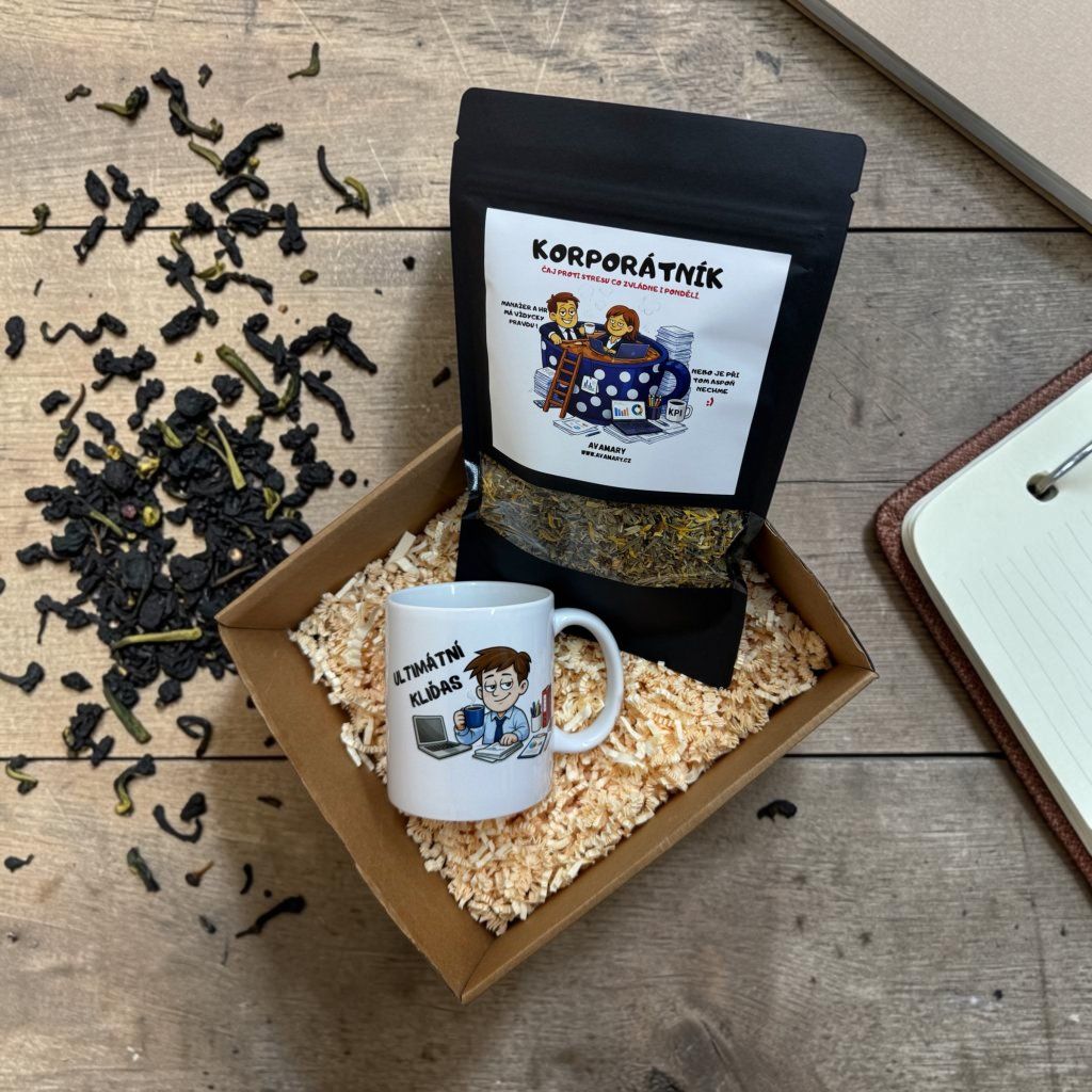 V setu najdete vtipný keramický hrnek o objemu 330 ml s korporátním motivem a k tomu bylinný čaj proti stresu, který pomáhá zklidnit mysl, uvolnit napětí a na chvíli vypnout mezi meetingy, deadliny a nekonečnými tabulkami.