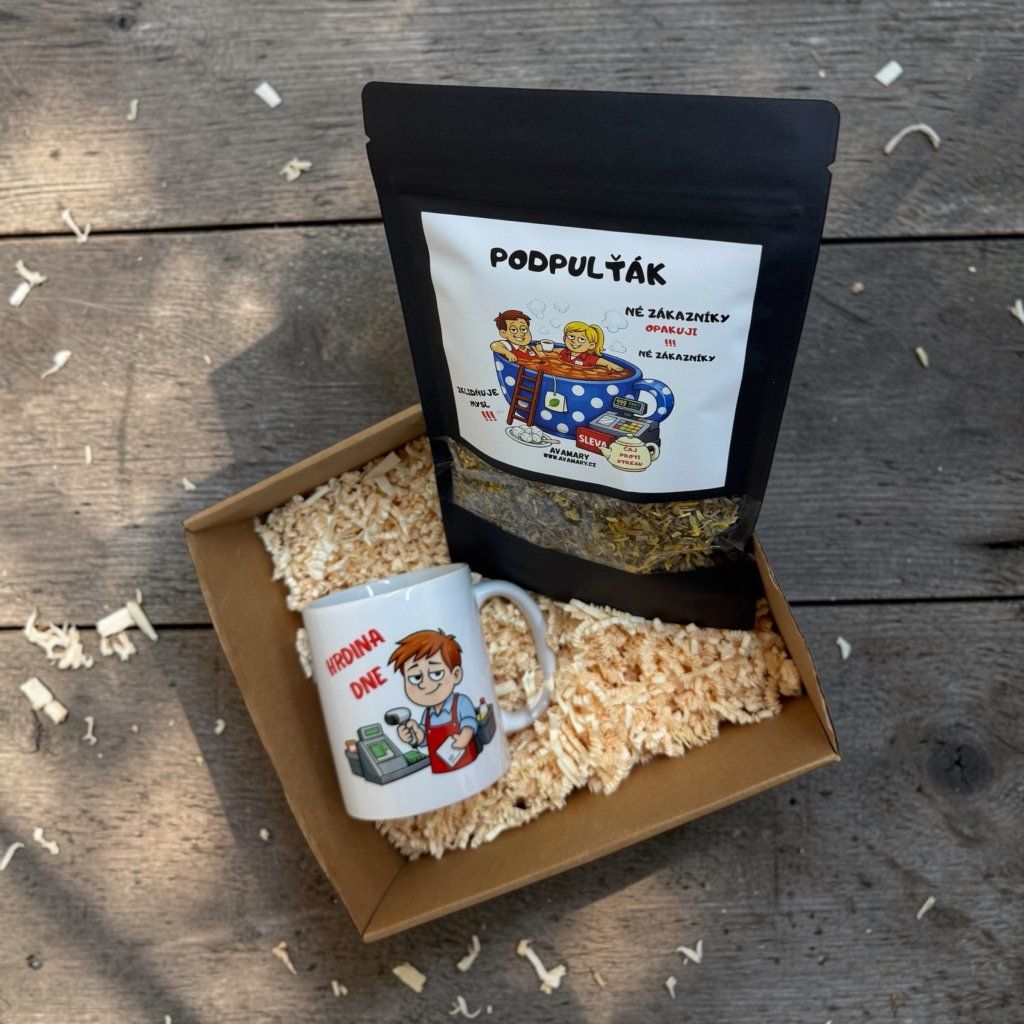 V balení najdete vtipný keramický hrnek o objemu 330 ml s motivem Hrdina dne a k tomu bylinný čaj Podpulťák proti stresu, který pomáhá zklidnit mysl po náročném dni plném zákazníků, otázek a nekonečného pípání pokladny.