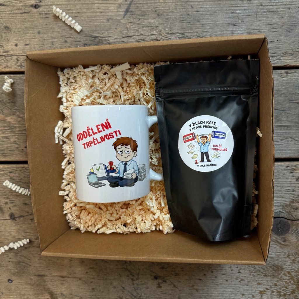 Protože každý úředník potřebuje svou dávku kofeinu. Tento vtipný dárkový set potěší všechny, kteří s přehledem zvládají formuláře, razítka, nekonečné předpisy, pondělní porady i fronty u přepážky.
