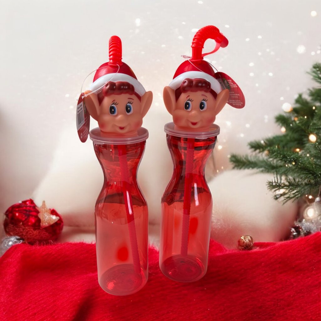 Veselá dětská lahev v červeném provedení, jejíž víčko zdobí usměvavý elf v čepičce. Součástí je praktické ohebné brčko, které se dá jednoduše schovat dovnitř.