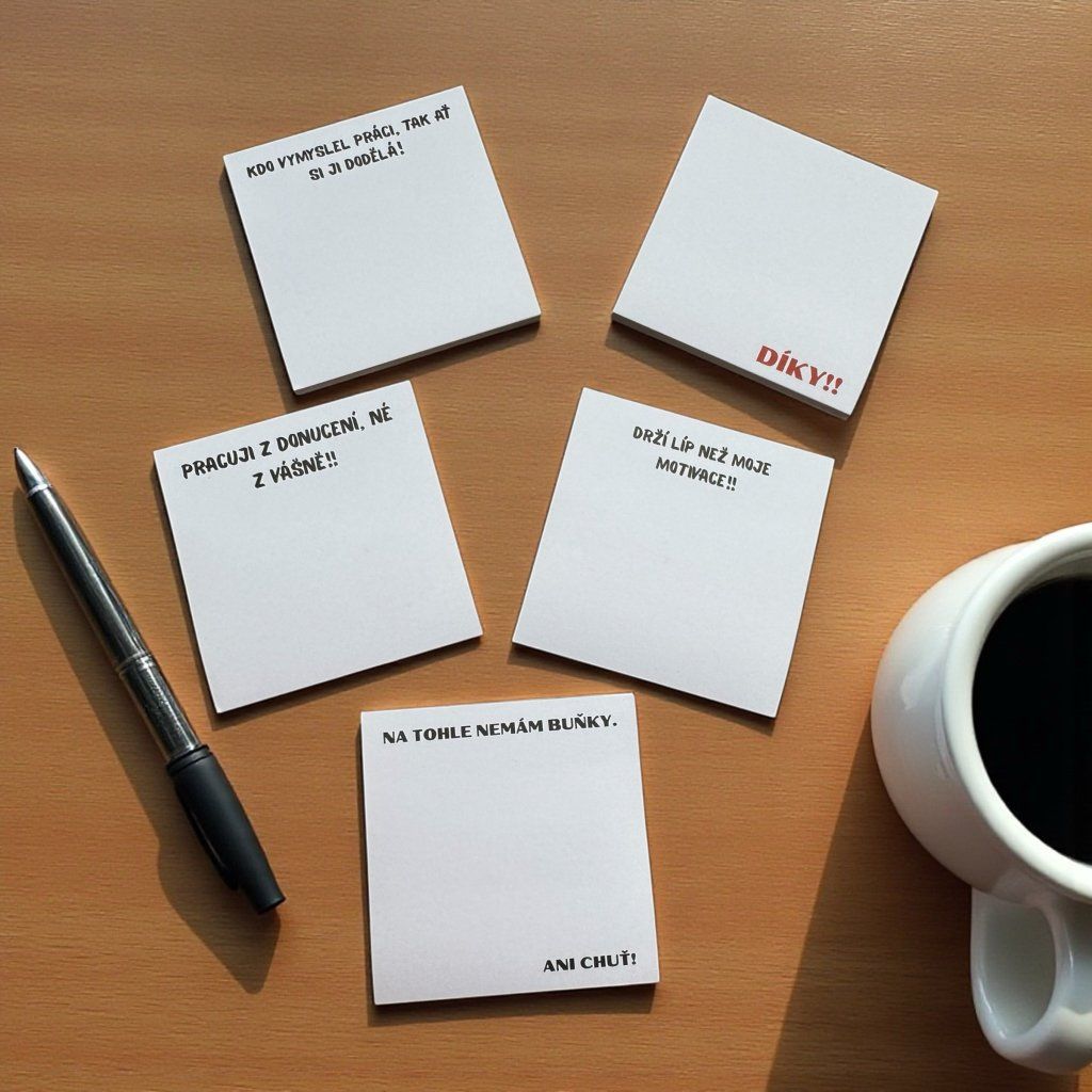Sezení na nekonečných poradách, schvalování PDF souborů a vyplňování tabulek? Jo, známe to. A právě proto vznikly tyhle nalepovací papírky s černým humorem, které ti zaručeně zpříjemní den v práci.